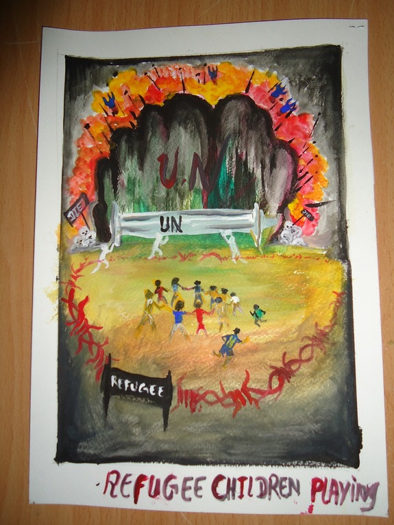 「Refugee(難民)」という看板がある赤い鉄条網のような中で遊ぶ子供たち。でも「UN(国連)」と書かれた柵の向こうでは、大爆発が起きていて、「DIE(死)」と書かれた看板が骸骨の上に刺さっています。
