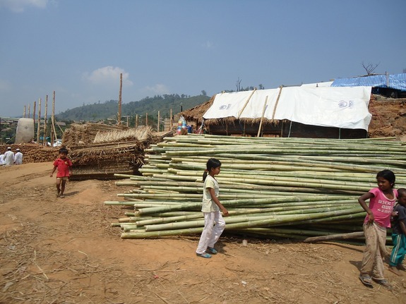 そのときに参加した、難民キャンプ委員会、UNHCR(国連難民高等弁務官事務所)、NGOの調整会議では、難民キャンプの住居の支援をしている団体から、「多くの再建資材は提供しましたが、屋根材については、まだ40%しか支給できていない状態です。」との報告がありました。屋根材はニッパ椰子の葉を使っていますが、一度に多く供給できないこと、さらにその背景には団体の資金難の問題もあるようです。もうすでに雨季が始まっていることもあり、多くの住民はどこかからこの屋根材を手に入れて再建を始めており、実際、UNHCRの白いビニールシートを使用している家は、あまり見られませんでした。
