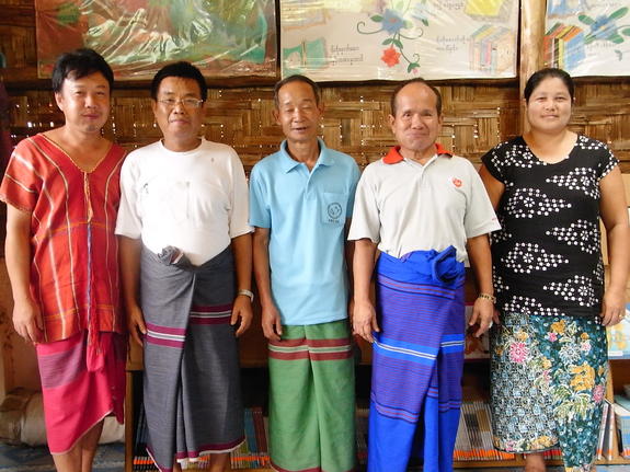 手前の緑色の衣装を着ているのが先生。機織の名人です。