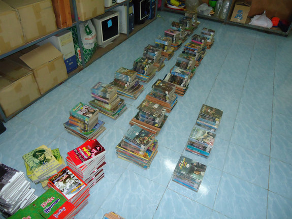 (メーソット事務所にて、7難民キャンプ21館分の図書を分けています。この後袋詰めして、難民キャンプへ届けていきます。)