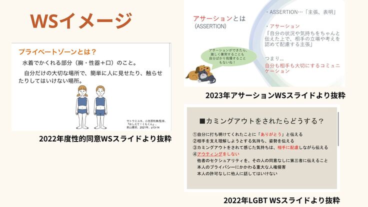 ワークショップ制作では、メンバーでテーマを決め、半年~1年かけて完成させ、それを発表します。これまで、アサーション、LGBTQ、性的同意、メディアとデートDV等をテーマに作成し、今年度も作成中です。