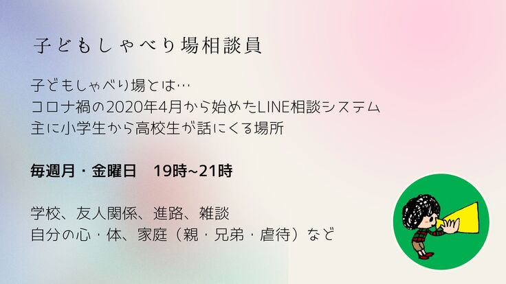 青年部に入ると、エンパワメントかながわの学校で実施するデートDV予防プログラムやCAPプログラム(https://npo-ek.org/ourprograms/)への参加、18歳以下を対象としたLINEでおしゃべりができる場である子どもしゃべり場(https://npo-ek.org/kodomoshaberiba/)の相談員として活躍することもできます。