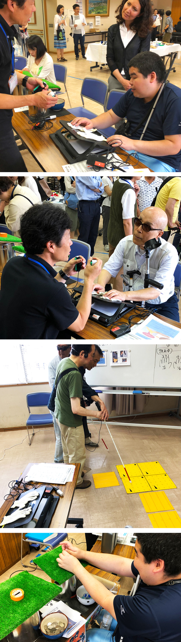 ハートウエアラボのブースにおいては、ウエアラブル指点字ツールの他、視覚障害者や盲ろう者の一人歩きを支援する技術(W&M視覚障害者歩行サポートシステムと連携 https://wmsystem.jimdo.com)、盲ろう児の自立活動を補助する療育ゲームツール(http://gakko.rdy.jp/kdb/search/detail/687)を展示し、実際に楽しみながら体験して頂きました。