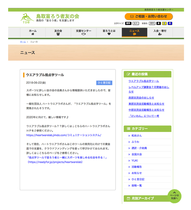 鳥取県のスポーツ課所属の方の目に留まったのがきっかけで、鳥取県盲ろう者友の会のホームページで、「ウエアラブル指点字ツール」とその普及に関わるクラウドファンディングの情報をシェアしていただけることになりました!