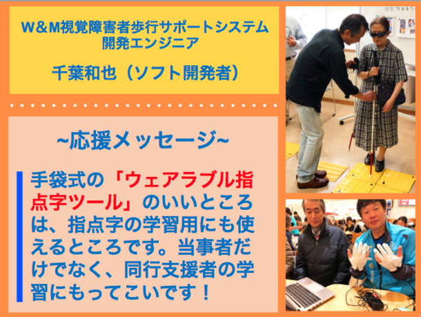 千葉さんは、「ウエアラブル指点字ツール」を「カメラ付きの白杖と連携させ、まちとつなげる”魔法の杖”」の取り組みなどに協力いただいています。