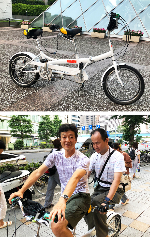 新宿の街をサイクリングに出掛けることになりました。九曜さんは、以前、タンデム自転車に乗ったこともあり、初めてのペアリングながらとてもスムーズ。