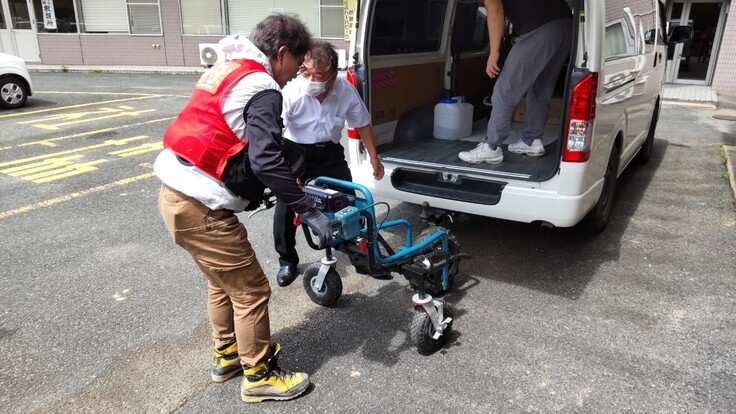 七山地区には、Civic Forceが参画し日頃から連携する佐賀災害支援プラットフォーム(SPF)やおもやいボランティアセンターの拠点があり、支援物資は主にこの拠点にお届けしました。被災した家屋などの復旧作業に尽力する支援団体の方からは「普通の一輪車ではあがれないような坂道も電動運搬車であれば行くことができ、とても助かる」とのお声をいただきました。