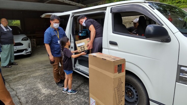 そこで、Civic Forceは特に被害の大きかった七山地区に電動運搬車を届けました。また、家屋が被災しトイレが使えない家があると聞き、非常用トイレや飲み物などもお渡ししました。