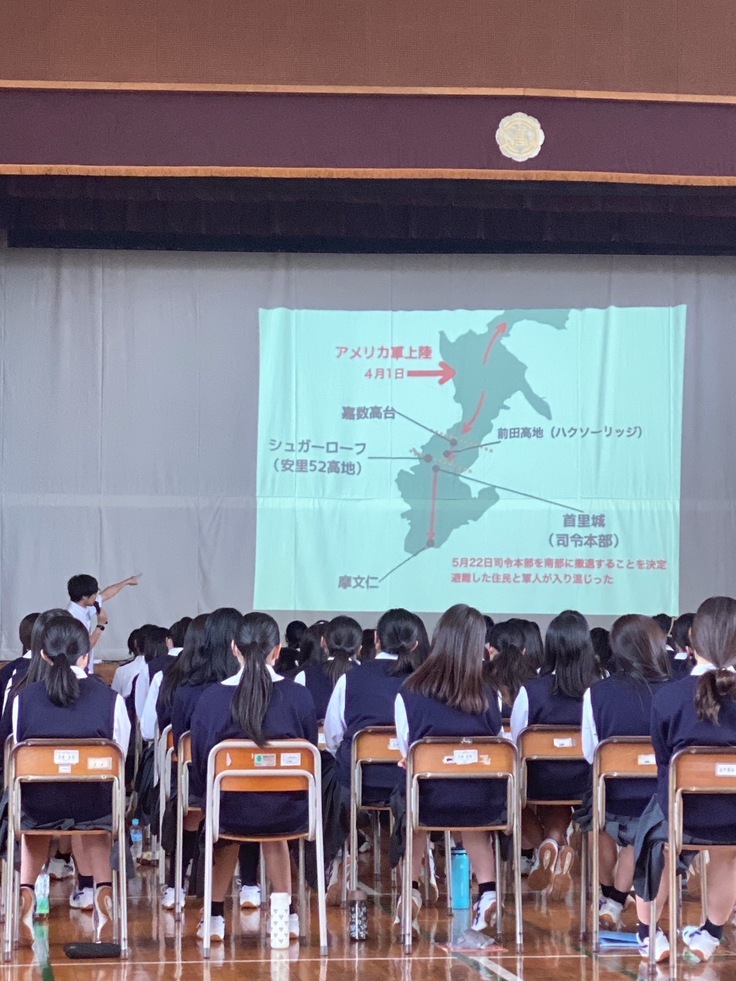 太平洋戦争の背景から沖縄戦のプロセスについてお話ししたあと、平和劇の上演をおこないました。
