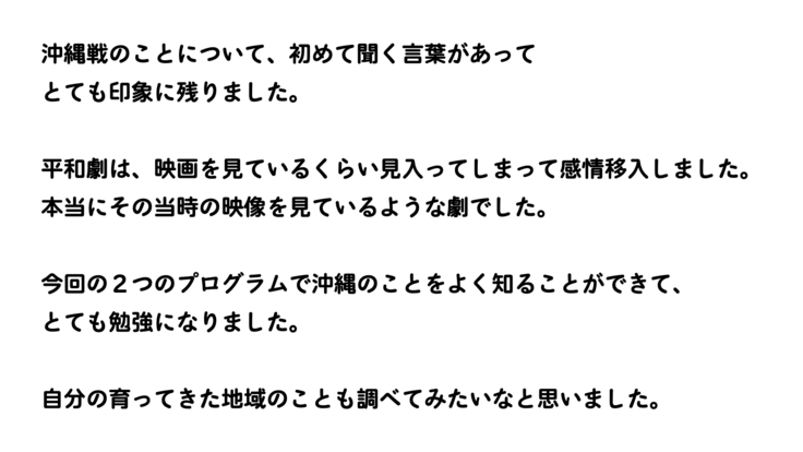 今回の平和学習に関して、生徒の皆さまから感想が届きましたので、その中から少しだけ紹介いたします。