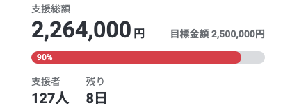 127名の方々から、およそ226万円のご支援が集まっています。達成まで残り25万円となっております。