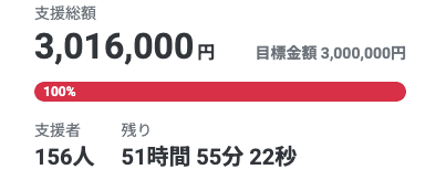 3月29日(土)19:00時現在、目標金額の300万円を超えるご支援をいただきました。