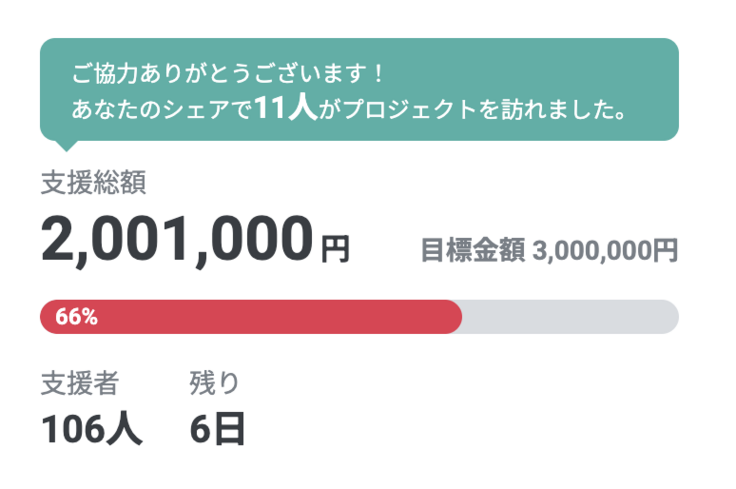 プロジェクト終了まで残り6日。目標達成まであと100円となっています。