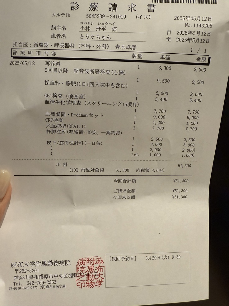 いつも思うことですが、麻布大学は一回の診療代かなり高いですね...😣