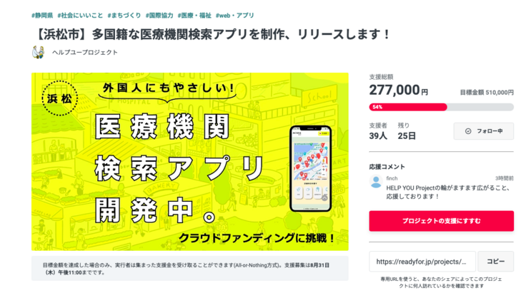 現在、浜松市でスタートしているクラファンが、54%まで届きました!