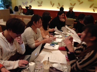1/10(土)は、新年始まって第1回目のミーティングです。 通常なら、momojiroのミーティングは上智大学四谷キャンパスで行っているのですが、 今回は都合により原宿のnoa*caféで行いました。朝早くからミーティングは始まりまし たが、時間通りに人数も集まりミーティングスタート!