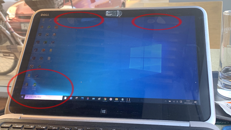 ・どこから入ったかわからない気泡(写真)で画面の歪み