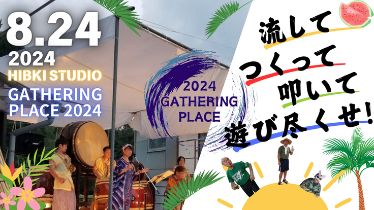 GATHERING PLACE 2024は、5回目を数えます。当初より、誰もが参加、参画できるイベントを目指してきました。ことのはじめは、10年前の響カフェで出会った当時の中学生が「流しそうめんをやりたい」というところからスタートしています。響スタジオ(埼玉県本庄市)の周辺には竹林があり、スペースの確保も容易であったことから、毎年開催することにしました。地元の子どもたちも多く参加し、流しそうめん大会自体は、10年続いています。多いときには80人ほどの参加者が集まった年もありました。近年は太鼓コンサートや太鼓教室生徒さんの発表なども兼ねて、一日に様々な要素をギュッと詰め込んだイベントとなっています。