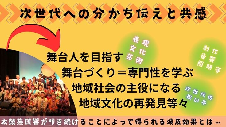 そして、イベントに限らずなのですが、太鼓集団響の役割の一つとして、次世代への「分かち伝え」を念頭に置いています。現在、太鼓集団響のメンバーは10代から50代で構成されています。響の演奏やワークショップで和太鼓を体験し、自らプロになりたいと志す者もここ数年で出てきました。舞台人=表現者だけではなく、舞台製作やいわゆる裏方の仕事に将来の目標を見出し、響が贔屓としているプロの舞台サービスさんに学び、進路を目指す若者にも出会ってきました。太鼓の諸活動を媒介に、あるいは触媒としながら、次世代の若者に寄与したいのです。