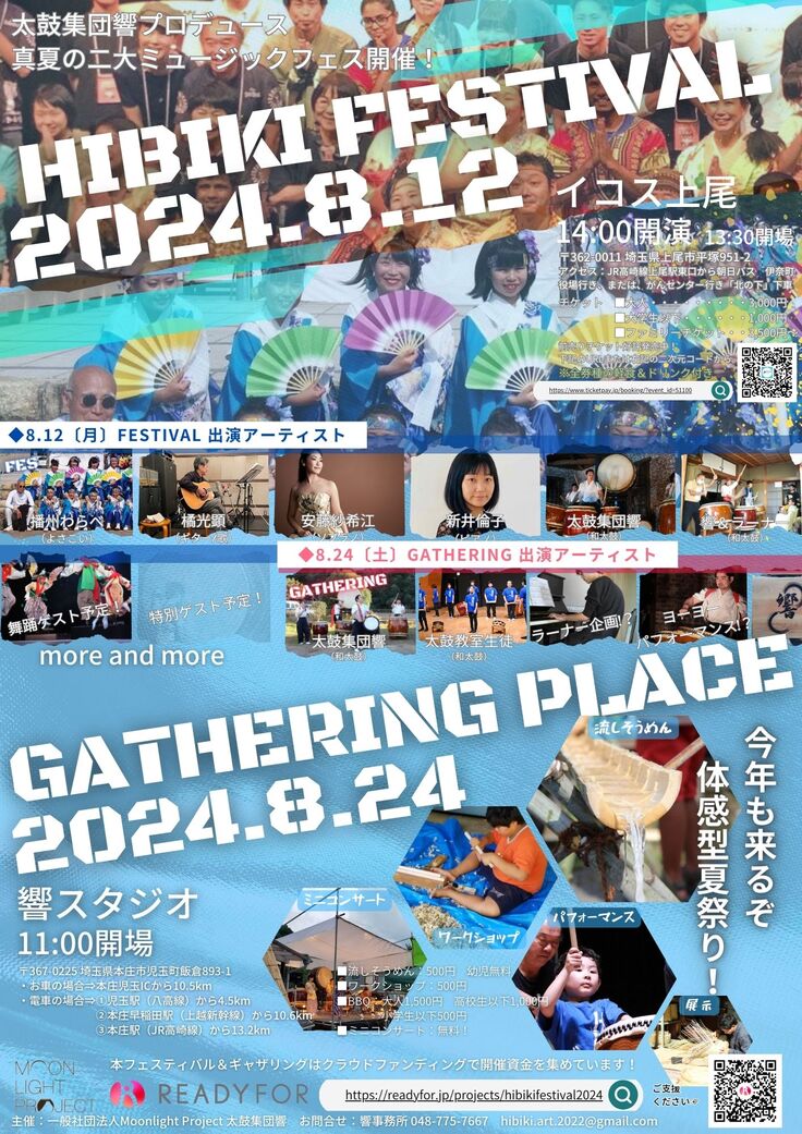 太鼓集団響(一般社団法人Moonlight Project)が主催する、夏の二大音楽フェスタを埼玉県上尾市と本庄市で開催したい。開催概要は以下です。 ■HIBIKI FESTIVAL2024の開催について。 2024年8月12日(月)イコス上尾。必要経費は会場費、付帯設備費用、舞台設営費用、フライヤー等宣伝費、国内外からのアーティスト招聘のための費用で総額は200万円ほど。すでに会場はおさえており、チケット販売は6月より開始しています。 ■GATHERING PLACE 2024の開催について…。 自然豊かな本庄市児玉町にある響スタジオ(太鼓集団響の拠点)で、体感型イベントを開催したい。8月24日(土)に実施。一日で流しそうめんやワークショップ、子どもや大人、プロアマを問わずに公募型で出演者を募るステージパフォーマンスと盛りだくさんの内容。イベントの費用は50万を想定しています。 現在、クラウドファンディング実施完了日までには、アーティストとの打ち合わせ(すでに兵庫などに出向き出演者とのミーティングを実施)や合同の稽古、フライヤーなどを用いて宣伝を行っています。事業総額は250万です。