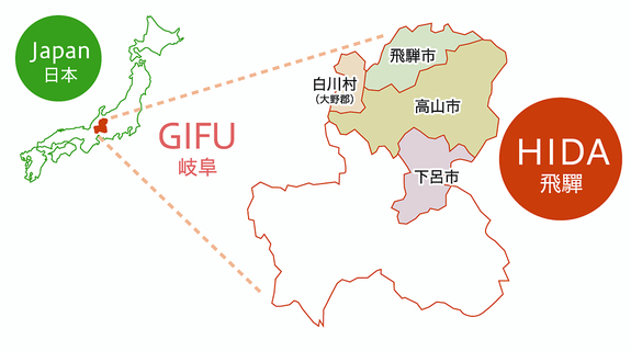 初めまして、岐阜県【飛騨高山(ひだたかやま)】出身の釜谷(かまや)と申します。いきなりですが問題です。まず岐阜県って日本のどの辺りにある県かご存知ですか?答えは日本の真ん中辺り。周囲をぐるっと他県に囲まれた海のない県です。その中でも県北部、現在の高山市、飛騨市、下呂市、白川村の3市1村を総称して飛騨(ひだ)と言います。