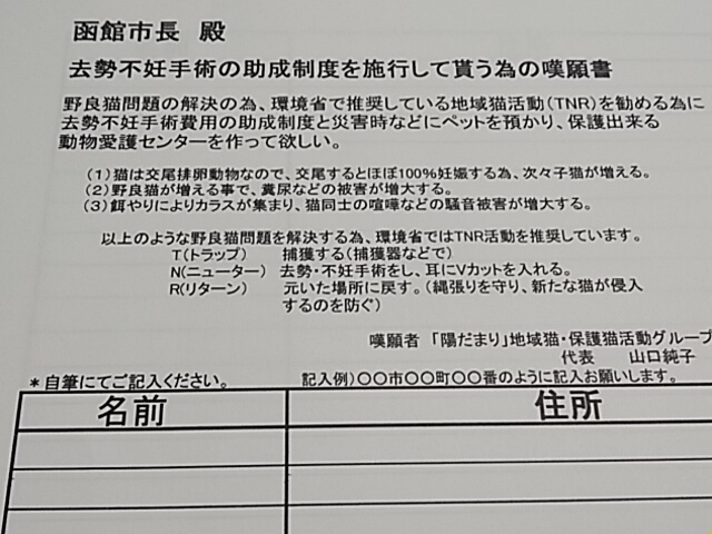 出来る限り多くの署名を集め、函館市が助成制度を作ってくれて、餌やりしたら去勢不妊手術するのが当たり前という認識を、市民に浸透させて行きたいと願っています。