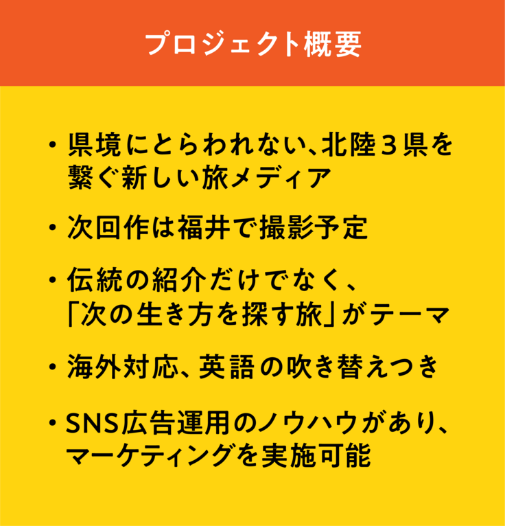 「北陸を横断する、上質な旅の動画メディアを立ち上げたい!]