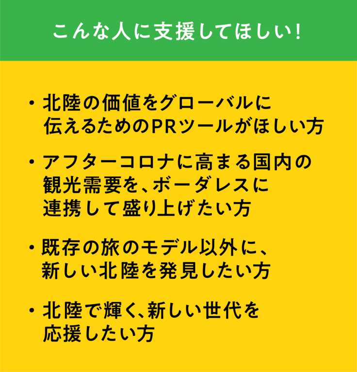 プロジェクトを開始してから、多くの新しい出会いを迎え、知らなかった扉が開き続けていくのを感じております。北陸を愛する皆様にとって希望になる新しいプロジェクトに、必ずしていきたいと思っています。