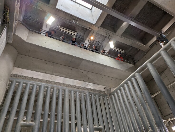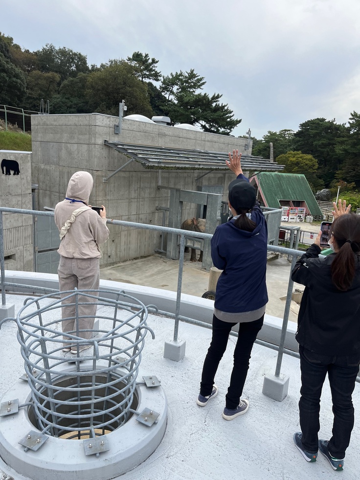 バックヤードの見学は夏休みの恒例イベント「うらがわ探検(多目的舎とゾウ舎の見学)」でも行っていますが、今回はクラファンリターンの特別バージョンとして、ゾウ舎2階の管理通路(キャットウォーク)やビューイングシェルターの屋上へもご案内させて頂きました♪