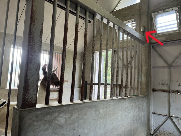 このコンセントを使い、スポットクーラーの冷気を舎内に循環させるためのサーキュレーターや夜間の行動観察などに必要な監視カメラの設置を計画しています。