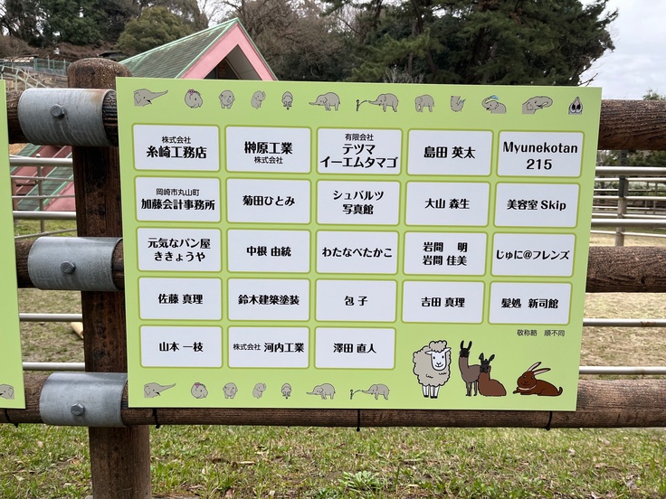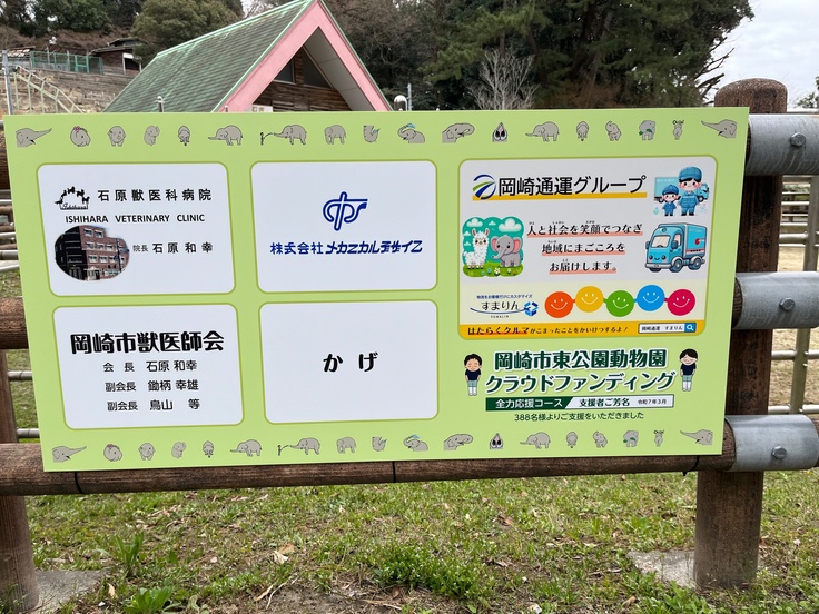 看板の周りには飼育員の描いたふじ子さんのイラストを配置して、かわいらしい芳名板が