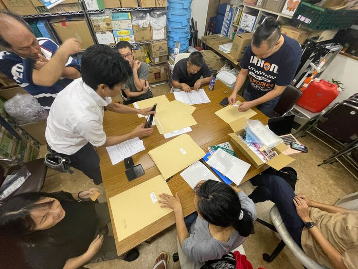 商店街事務所に広報部が集まり、配送準備を進めました。