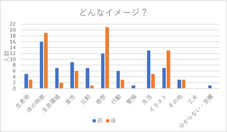 具体的には、前は知っている内容を羅列した回答が多く、全体的にさまざま項目の回答が見られたのに対し、後はどの種も担当動物に対する印象の記述やイラストを用いて体の特徴を説明する内容が増えていました。