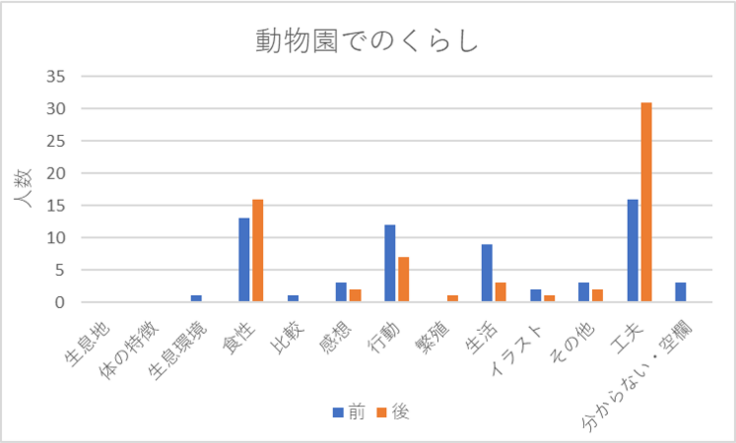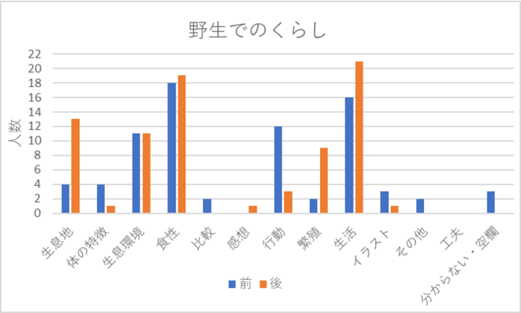 また、前では、さまざまな項目の回答が見られ、一般的によく知られている内容の記述が多かったですが、後では動物のくらしに関する項目の回答が増え、より詳細な内容の記述が多かったです。