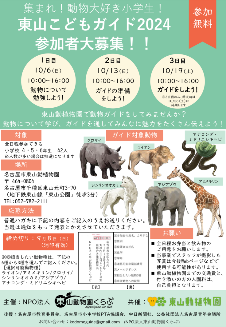 NPO法人東山動物園くらぶが「東山こどもガイド 2024」を行う際の、会場や道具の準備、移動等に資金を利用いたします。