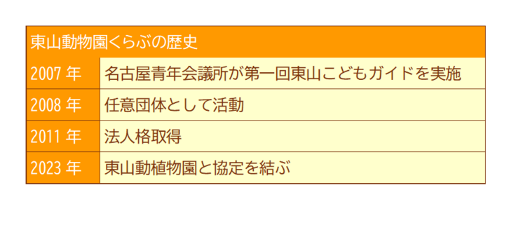 2008年度にはこの企画を継続していこうと有志が集まり、当団体の前身である「東山こどもガイド実行委員会」を立ち上げ、第2回「東山こどもガイド2008」を実施しました。さらに、動物園で幅広い活動をおこなえるよう2009年度には任意団体「東山動物園くらぶ」と名称を変更し、2011年には法人格を取得し、NPO法人として活動しています。現在も活動を続けており、2023年には名古屋市と協定を結び、東山動植物園からも信頼されてきている団体です。