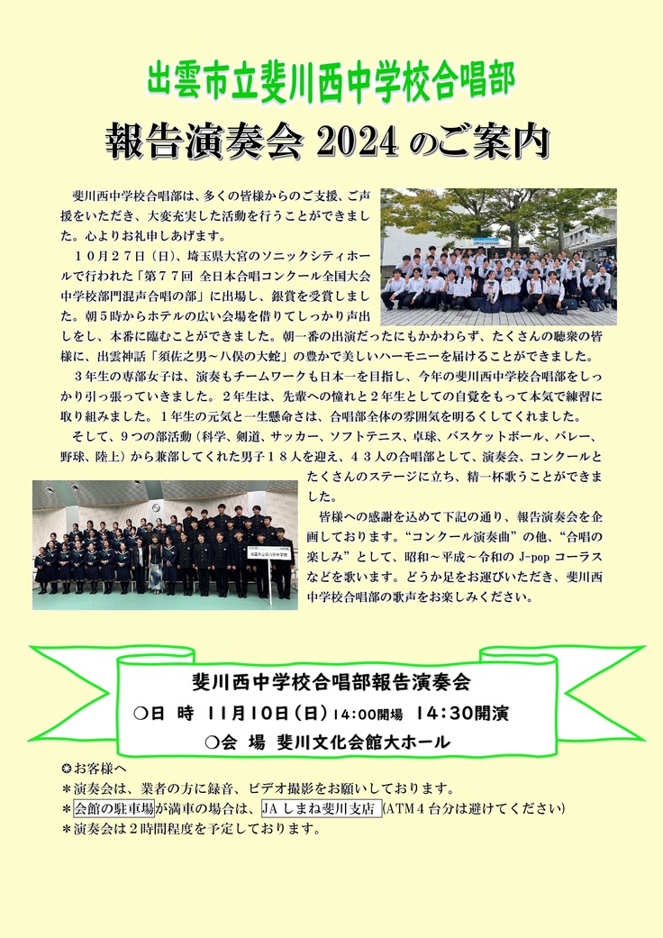 【斐川西中学校合唱部 報告演奏会2024】のご案内
