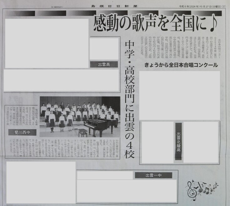 10月27日、島根日日新聞の日曜版(第4日曜発行で10月26日(土)の新聞に折り込まれています)に斐川西中学校合唱部の記事を掲載していただきました。