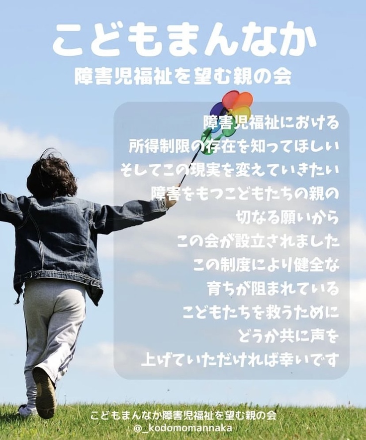 障害児福祉における所得制限の存在を知って欲しい、そして、この現実を変えていきたい。障害をもつこどもたちの親の、そんな切なる願いからこの会が設立されました。障害をもつこどもたちの育ちを支えるための「療育」や「装具」や「医療費」にも、親の所得の高低によって支援への所得制限があります。この制度により、健全な育ちが阻まれているこどもたちがいます。そんなこどもたちを救うために、私たちは活動をしています。