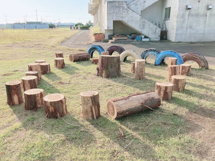 坂井森林組合さんから杉の木の丸太をいただいたので、並べてコミュニティサークルを作ってみました。