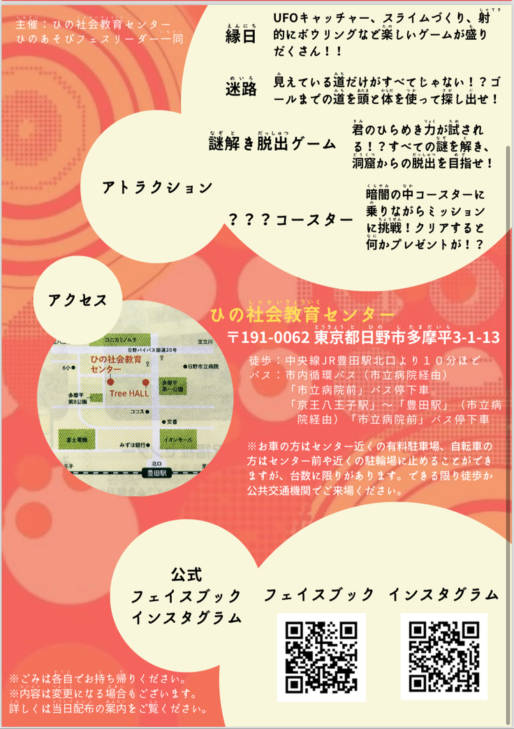 またアトラクションなど、ひのあそびフェスについての詳しい情報についても添付されている下記のチラシをご覧いただけると幸いです。