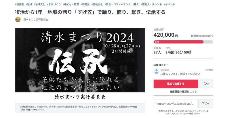 《清水まつり》のクラウドファンデイング、本日最終日になっています。