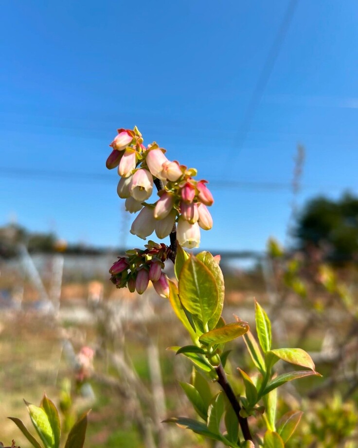 農園ではブルーベリーの花が咲きはじめました。小さな固い蕾が春の暖かさでゆっくりと膨らみ、花を開きはじめています。ブルーベリーの花は釣鐘のような形でひとつひとつ見るととてもかわいいお花です。これが夏にはたくさんの実になる事を今は心待ちにしています。