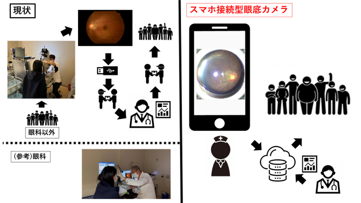 今回、我々はスマートフォン接続型の眼底カメラを使って眼科医が遠隔で読影し、眼科医療につなげていく仕組みの構築に挑戦し、多くの患者さんに眼科医療を届けることを目指します。