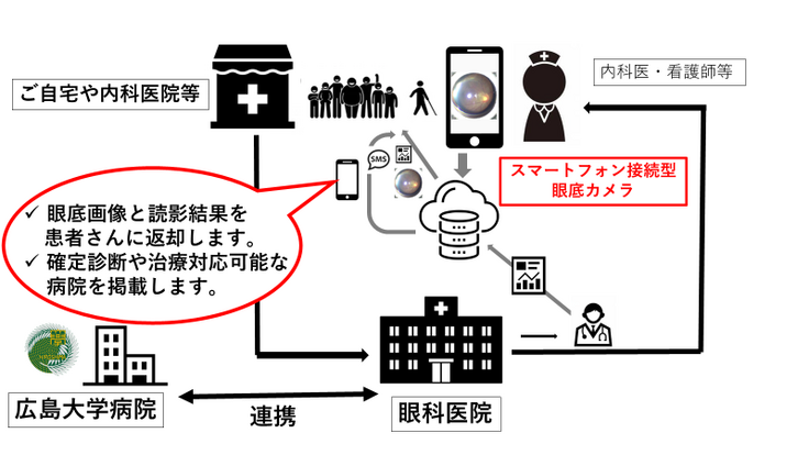 この問題を解決する最も現実的な方法が、眼科ではないかかりつけ医が簡便に使うことができる眼底検査装置の開発と眼科医による遠隔診断の組み合わせです。本プロジェクトは本邦で初となるこの組み合わせの実証実験であり、広島県のみならず日本全体にとっても非常に有意義なものです。ぜひご協力のほど、よろしくお願いいたします。