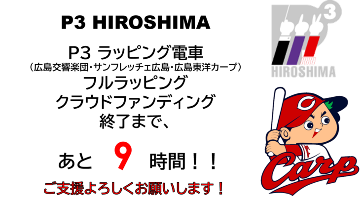 「PIECE PEACE HIROSHIMA」プロジェクトが終了まであと9時間となりました。 生まれ変わるラッピング電車は、多くのファンの皆様とともに作り上げたもの、そして、皆様に愛される電車になってほしいと思っております。