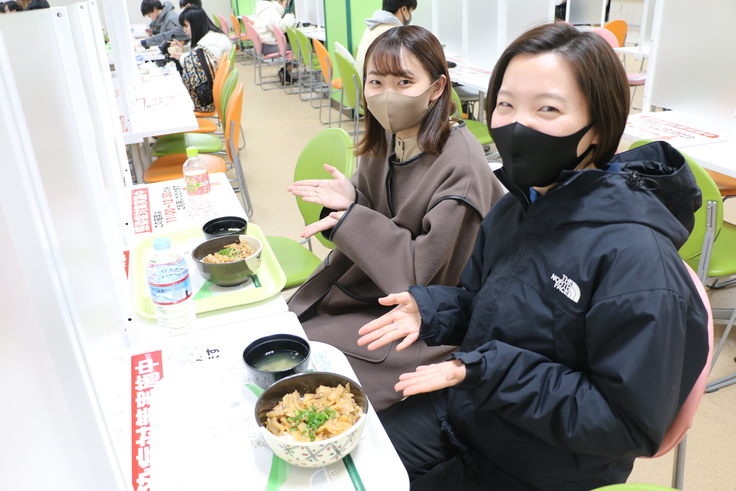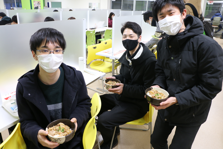 〇たくさんの方々からの支援のもと昼食を100円で頂き、学業や研究に集中して励むことが出来ました。本当にありがとうございました。来年からは社会人になるので支援していただいたみなさん、地域に少しでも還元できるよう精一杯努力します。