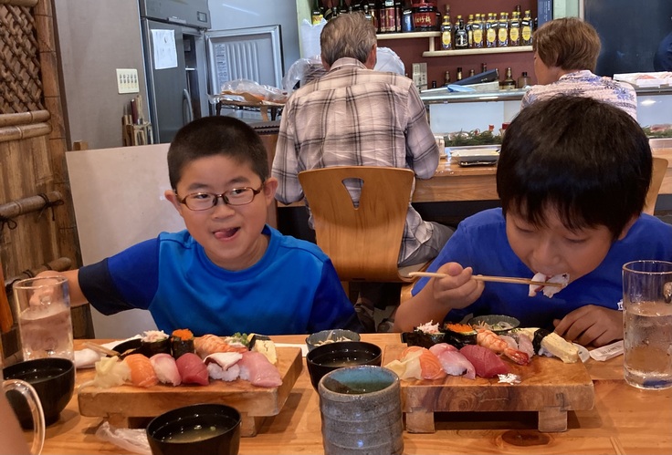 地元のお寿司屋さんで腹ごしらえ。前日までのヒル探しに奔走した余韻の中、気合いが入ります。