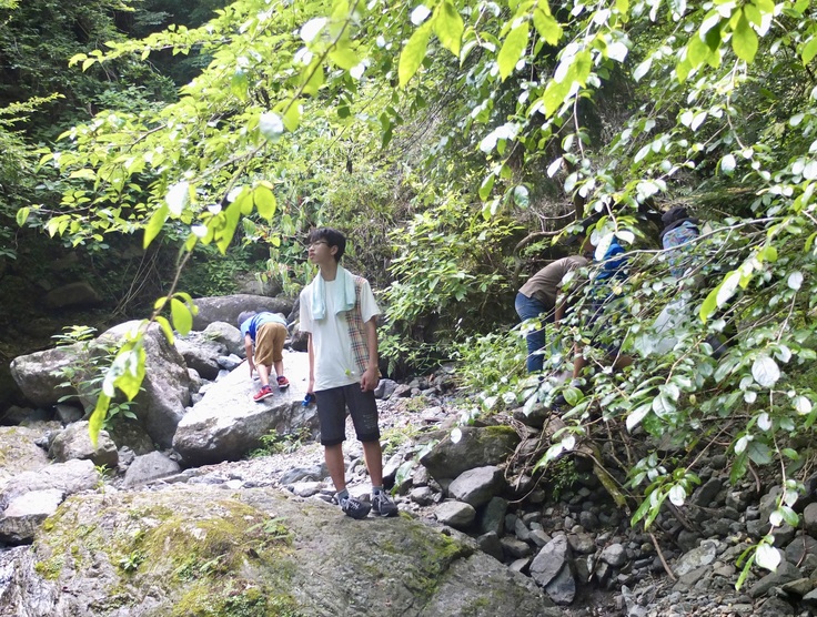 昼食の後、宿泊先の表丹沢野外活動センターに移動しテントの設営、3日間のキャンプ準備をした後、いよいよ明日のヒル採り予定地を下見に。地元森林セラピーガイドのKさんとIさんの案内でまずは沢ぞいの幾分湿った候補地に向かいます。現地に着くとヒル研研究員の目が鋭くなった。素早く散開しヒル探しが始まる。さすがヒル研、胸がときめきます。