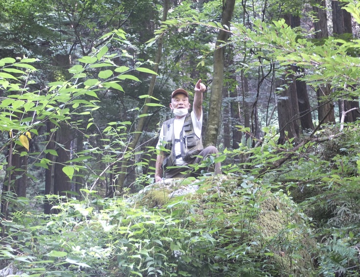 俯瞰してヒルの溜まりそうなヤマ筋をトレースする樋口先生。眼光が鋭い。